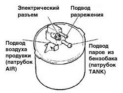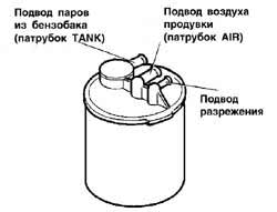 Основным элементом системы улавливания паров бензина является угольный адсорбер. Канистра адсорбера имеет три штуцера. Первый штуцер (TANK) соединен трубопроводом с бензобаком. При повышенном давлении в бензобаке пары бензина поступают в адсорбер, где удерживаются активированным углем. Через второй патрубок адсорбер соединен шлангом с дроссельным патрубком, установленным на двигателе. В разрыв шланга между адсорбером и двигателем подключен клапан продувки адсорбера.